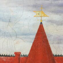 Antique folk art oil on canvas portrait of a Victorian house, 29.75 x 21 inches, signed “Anderson 1888.” In life, the Queen Anne style building would have been a pile of competing forms: the rounded and conical turret, protruding gable, front porch, decorative roof line, and of course, the elaborate gilded weathervane. The ornamental millwork depicted would have added another layer of tactile complexity, and the polychrome and striped painted exterior would have only made the “picturesque” massing even more sculptural and eccentric.