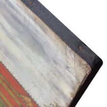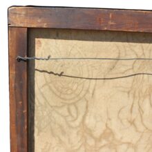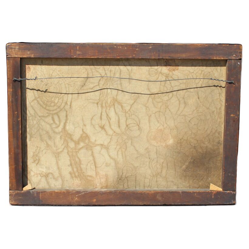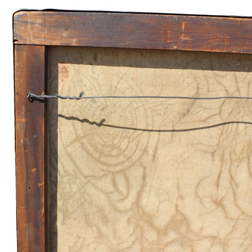 The painting is unframed, which seems to add to its abstract two-dimensional quality. Its canvas shows craquelure, which with its curves and spirals adds a marked contrast to the style of the painting and makes the piece even more visually striking. The piece also appears to have been conserved, the edge of the stretcher lined with a black band. Overall, the painting is in a fine state of preservation.