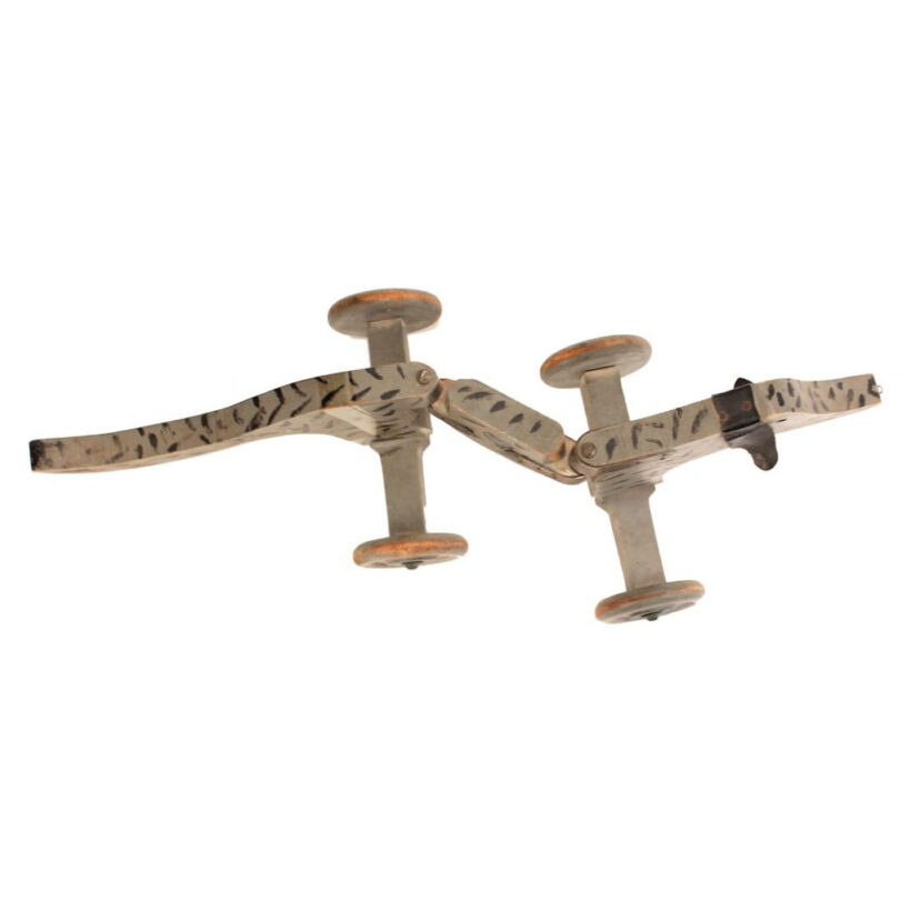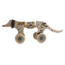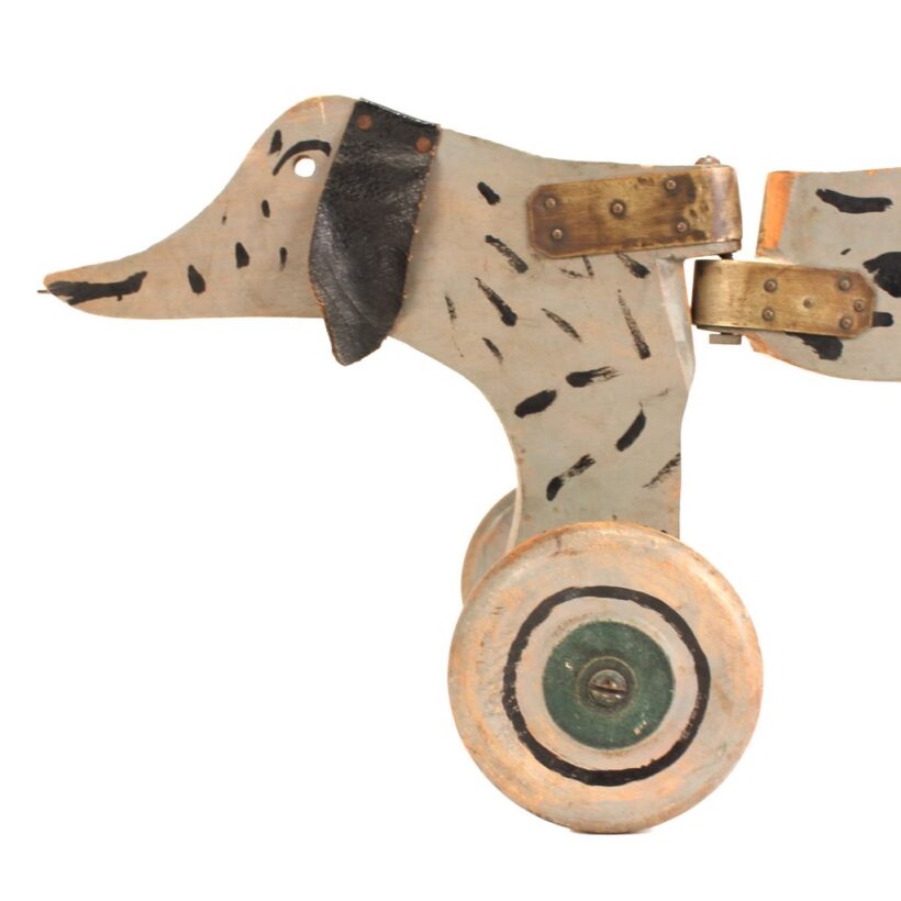 Antique folk art dog pull toy, c. 1930s. With its hinged body, the dog moves with an exaggerated wag like an excited pup as you pull it forward. Black canvas ears. Great old paint. One of my favorite homemade toys I’ve found.