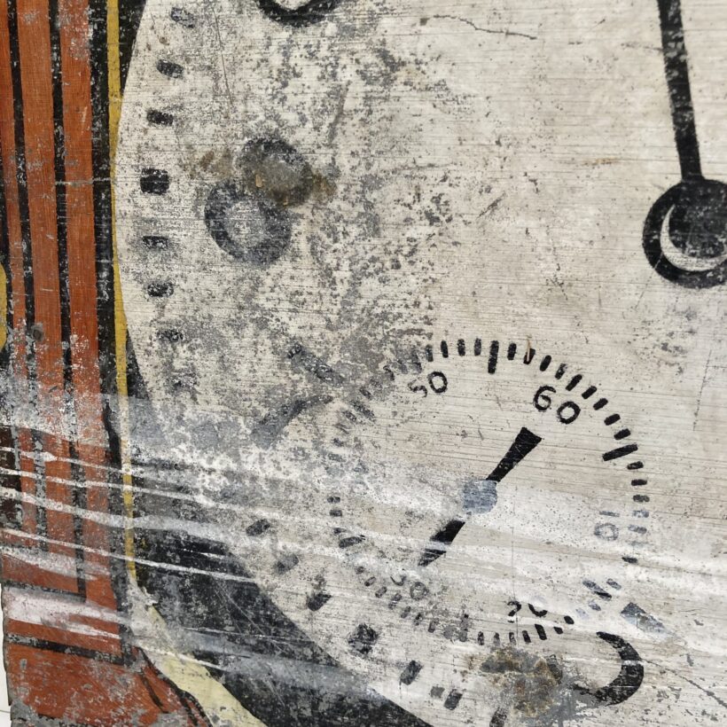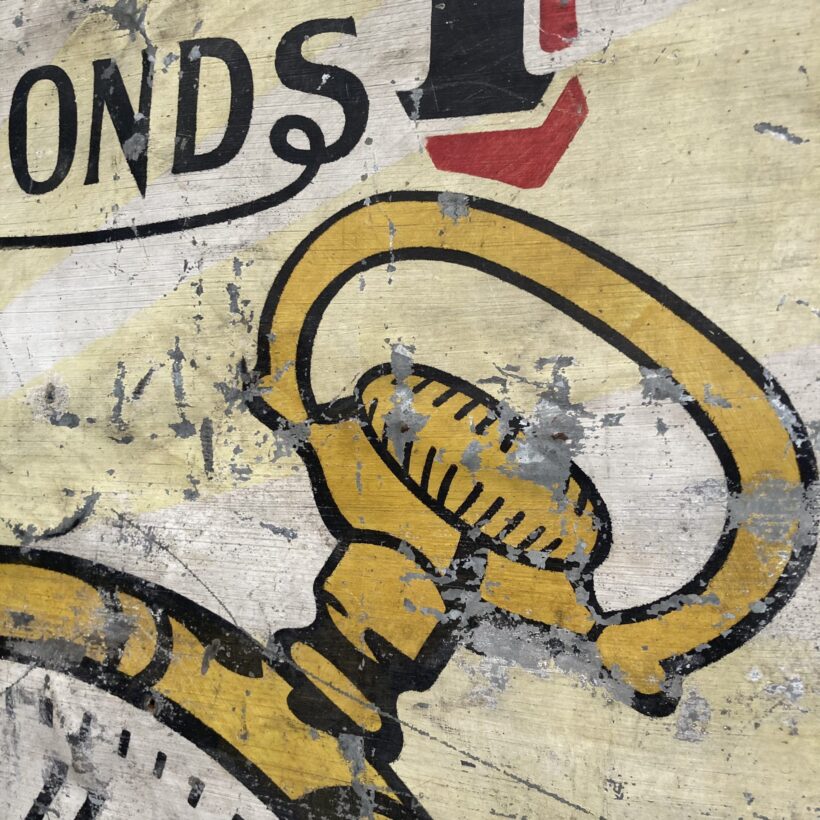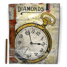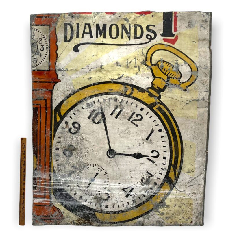 Cut-down painted watchmaker’s tin sign dating to the turn of the 20th century. Given the snippets of lettering, the original sign would have been enormous, likely covering a good portion of a commercial facade. Signs such as these often only survive in fragments, broken up and used as make-do roof and wall patches. This particular one is happenstance poetry, cut to shards of time denoted as diamonds.