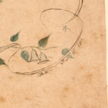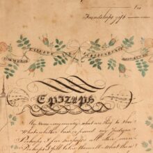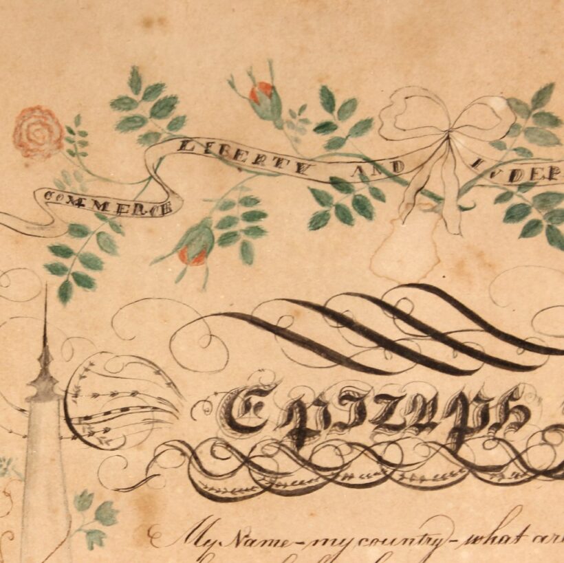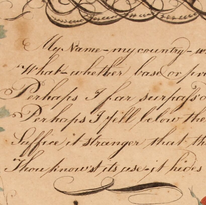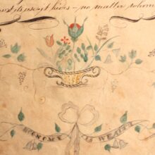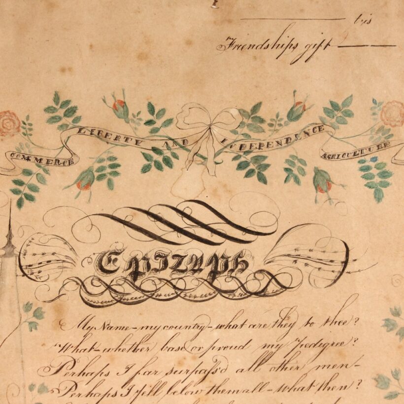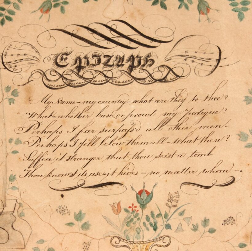 Antique and original early American folk art watercolor and penmanship sampler “Friendship Gift” dated 1822 and signed J.B. Miller. The watercolor floral garlands and funerary icons are exquisitely rendered, as is the careful script of the “Epitaph” calligraphic text. The piece quotes the lines of William Cowper, and reads: