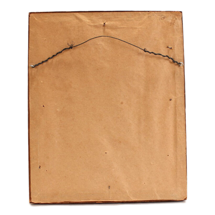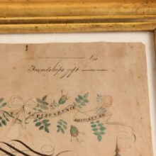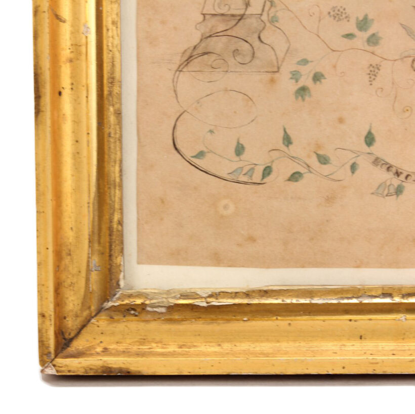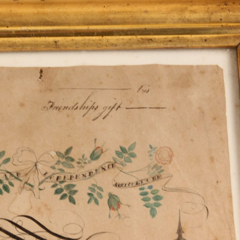 The slogans ”Commerce, Liberty, Independence, Agriculture” and “Economy is Wealth” are also written in banners among the garlands. The piece is signed and dated J.B. Miller and 1822 in the lower right hand corner. Framed in an antique period appropriate gold frame. A charming piece of American folk art painting found in New Hampshire.