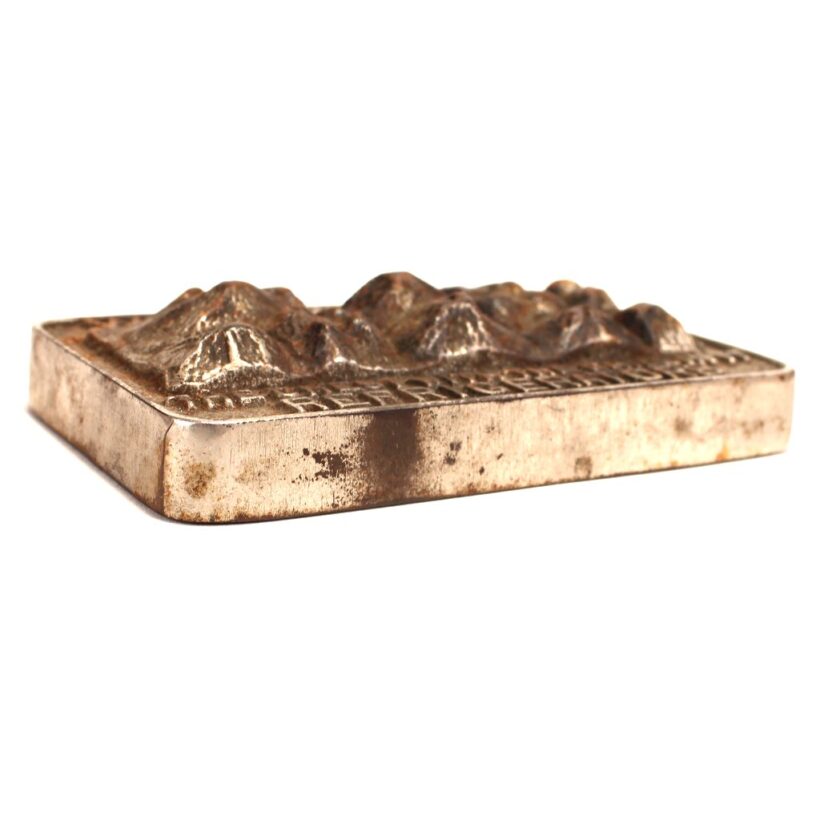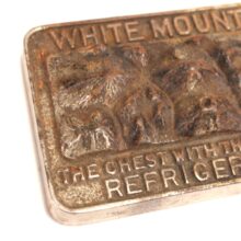 Antique White Mountain Refrigerators “The Chest with the Chill in It” nickel plated cast iron advertising paperweight, c. 1910. Once based in Nashua, New Hampshire, the company advertised its home terrain here in iron with a figural relief of the actual White Mountains. A classic souvenir of NH history.