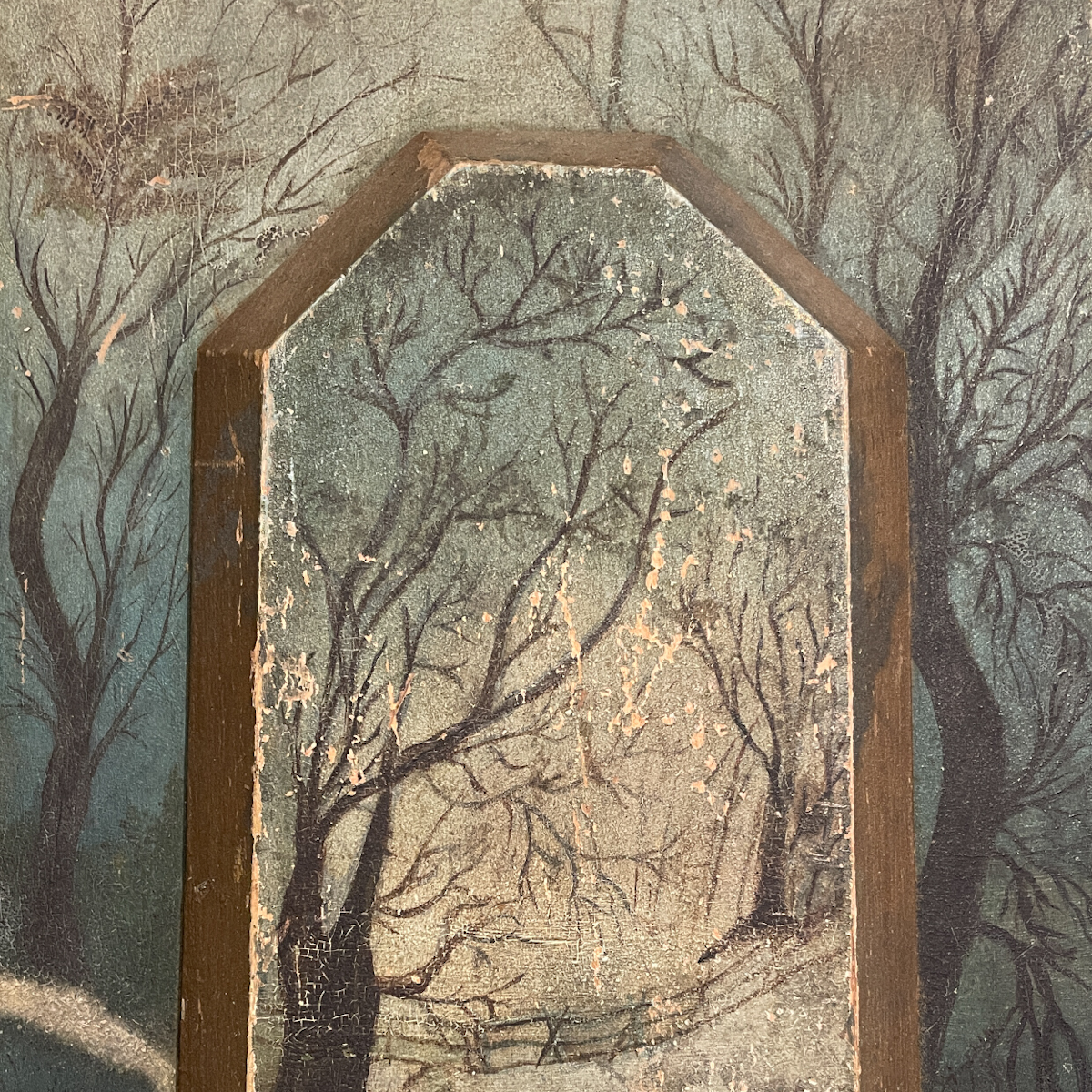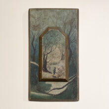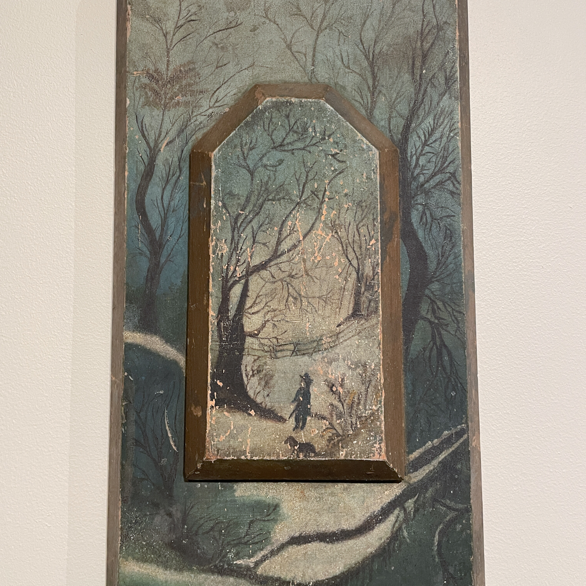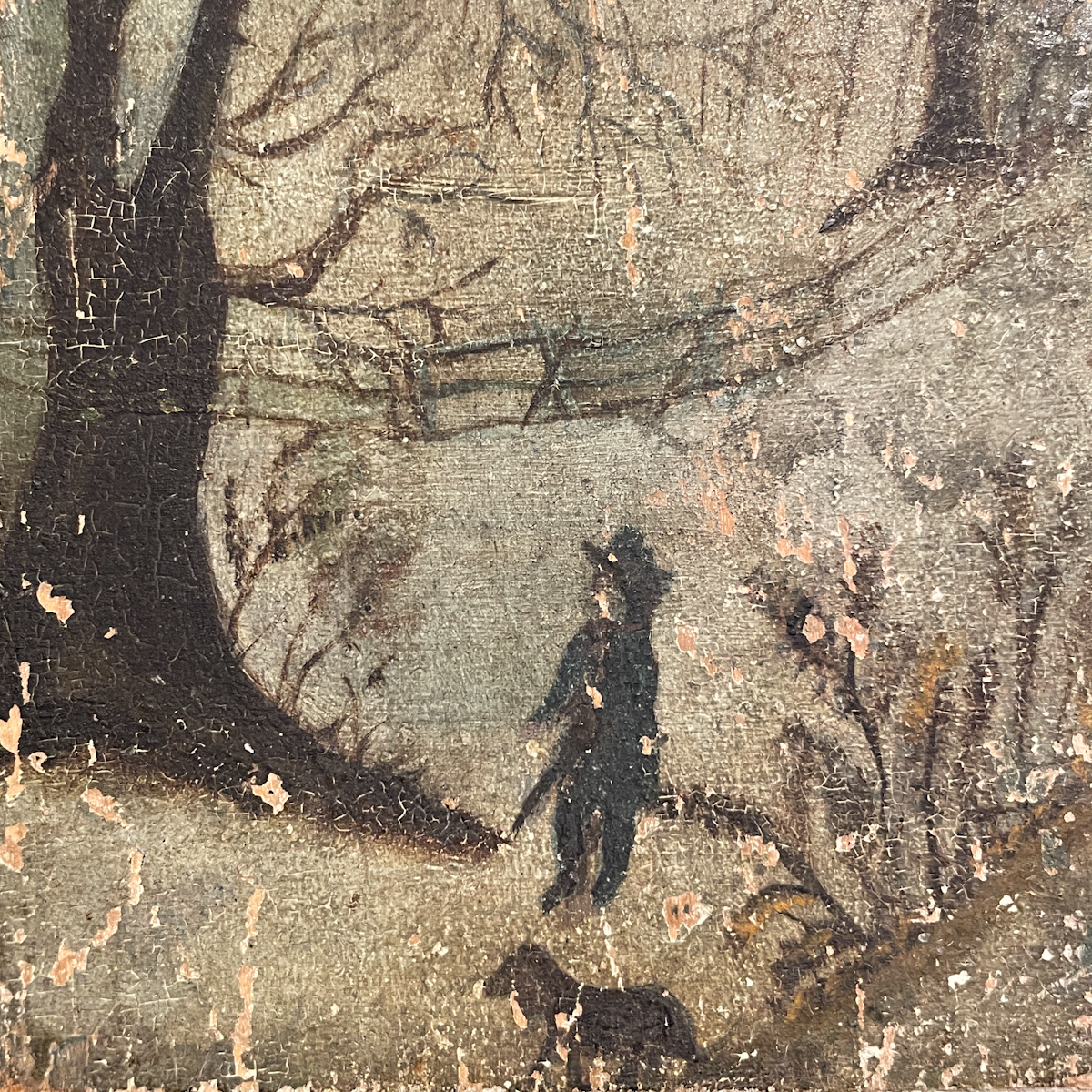 Painting of man & dog in wintry woods / oil on raised panels / Artist Unknown / ca. third quarter 19th century