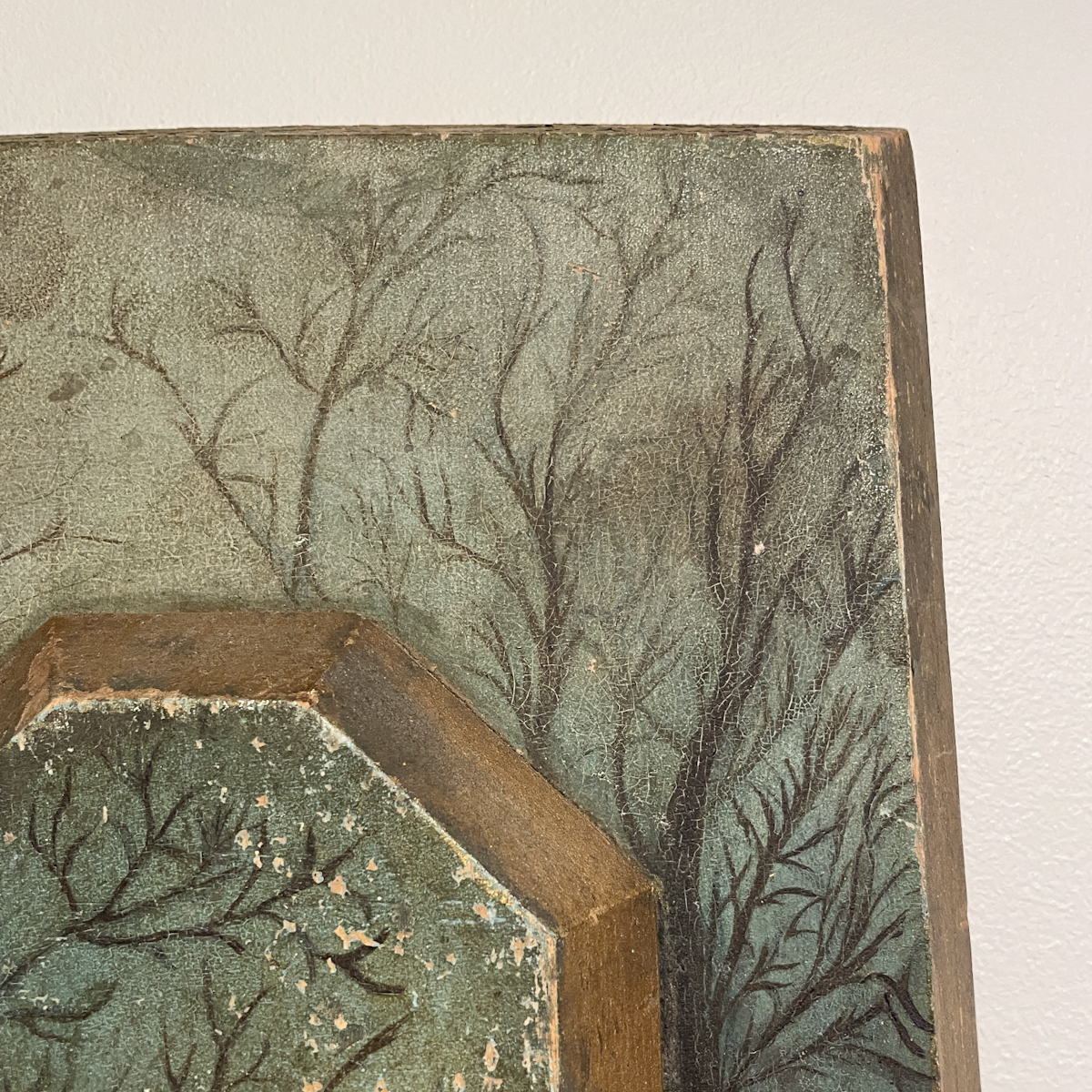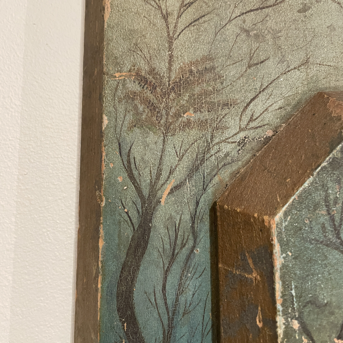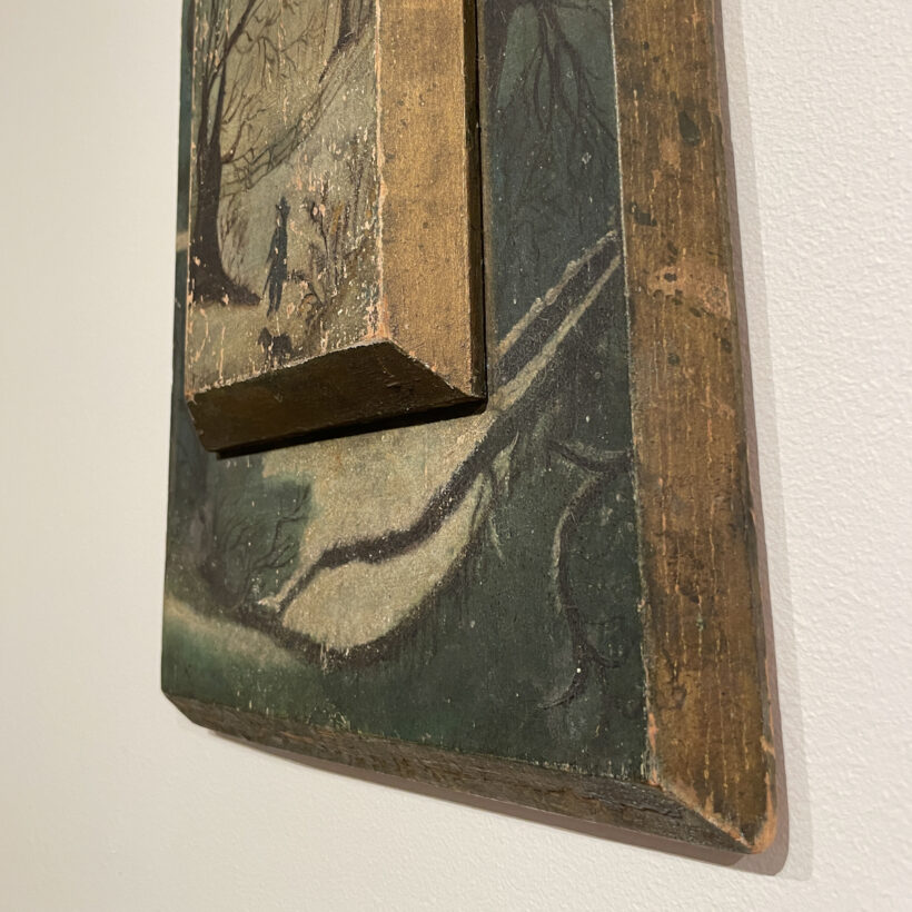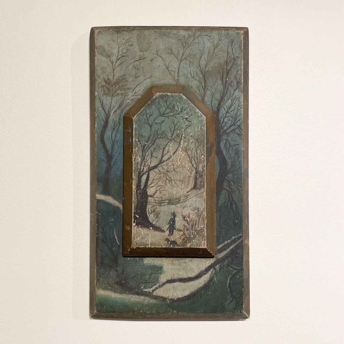 Evocative folk art painting with a unique canvas taking the form of stepped wooden panels chamfered at the edges. At a depth of two and a half inches, the second panel raises the immediate environs of the man and his dog to the forefront, which also seems to heighten the impression of their experience: a moment alone in a still and snowy wilderness.