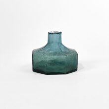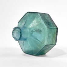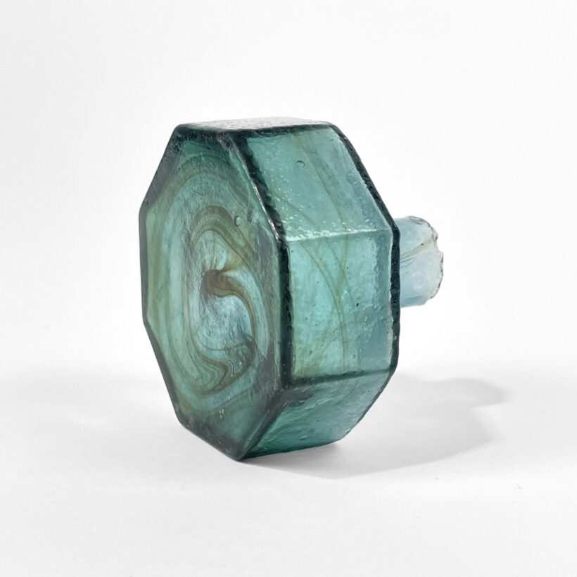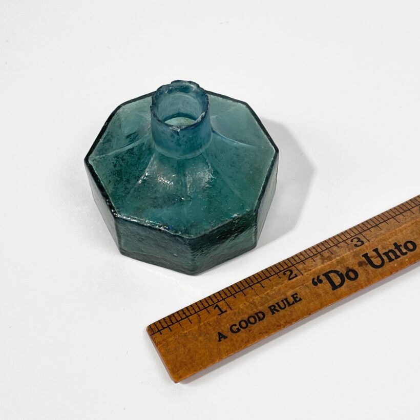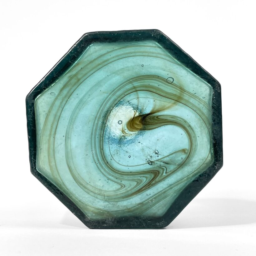 Early octagonal inkwell, c. 1830s. Beautiful blue-green colored glass with marbled swirl of colors at base. A strikingly modern form, the piece would make for a lovely bud vase or pen holder.