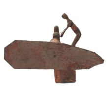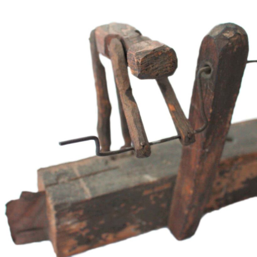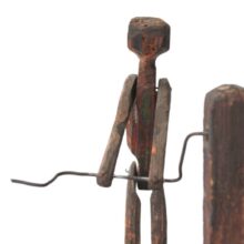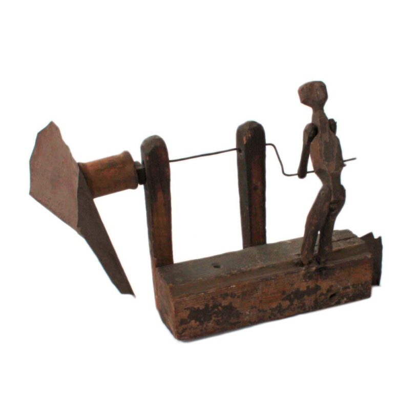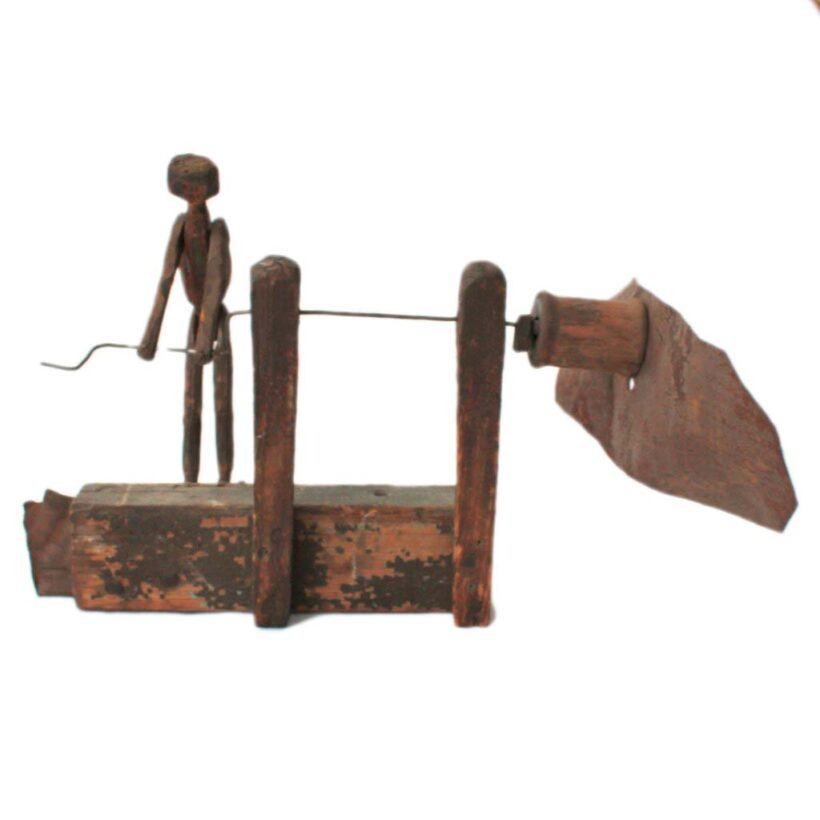 Antique turn of the century handmade folk art whirligig with a wooden figure who appears to labor at turning the wind-spun metal blade when it’s actually laboring to move him. Unusual smaller size at just over six inches tall. Great old weathered patina. The wind worked the fellow so hard that his face wore an impression in his forearms over the years. A simple design and humble form, but one of the most evocative whirligigs I’ve had.