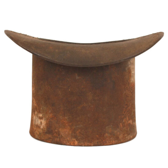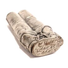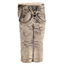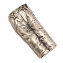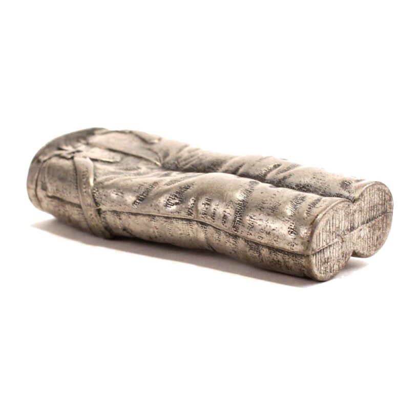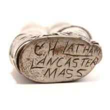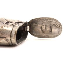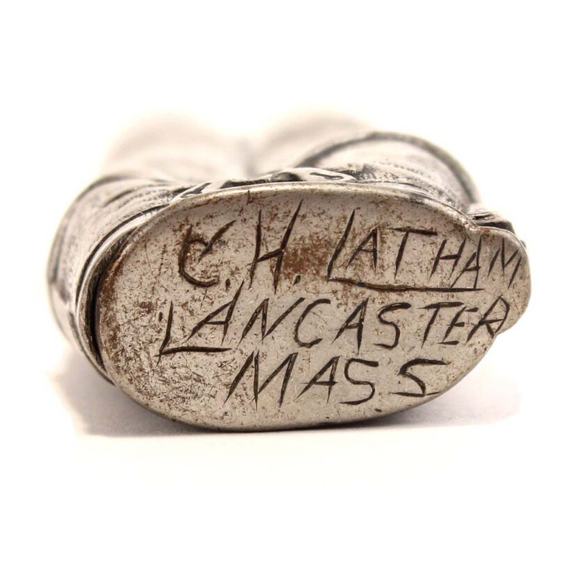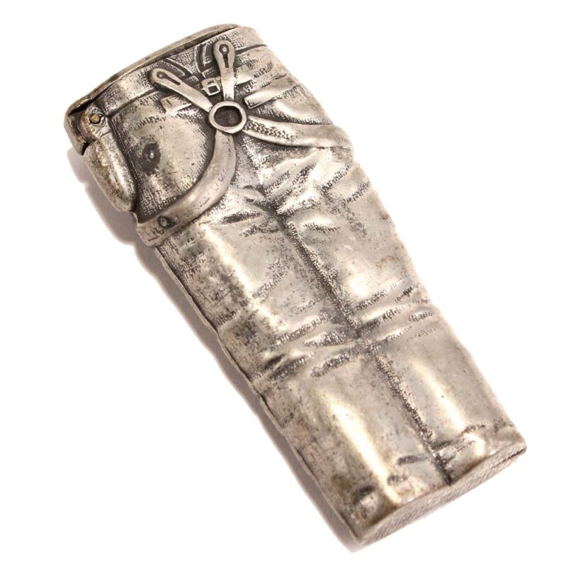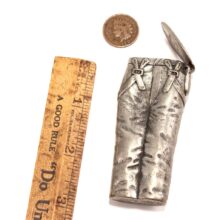 Rare antique pewter figural pocket match safe in the form of workwear pants, apparently blue jeans, c. 1880s. Though only three inches tall, the match safe is detailed down to the buckle back, suspender buttons, and even the weave in the denim. The bottom of the hinged lid reads “Pat. Nov 9 1886” and at the time, these Levis style riveted pants would have been called “waist overalls.” The top of the lid is hand-inscribed “C.H. Latham, Lancaster, Mass.” (From a little research, Mr. Latham was a poultry farmer, and was known for his photographic portraits of his birds.) The match holder is worn in smooth like an old pair of jeans with just the right amount character. It’s in great, usable condition, and ready for your pocket.