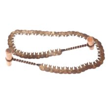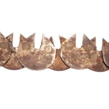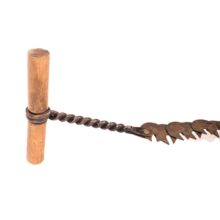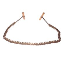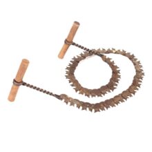 Extremely rare folding chain link two-man saw, c. early 20th century. The links are stamped “Simonds Mfg Co.” The saw is composed of chain link teeth with wooden and twisted iron handles. I could not find a single example of this saw in my research. According to an antique tool expert I spoke with, the saw may have been US Army issue during WWI, folding and thus easy to transport, and would have originally had a leather case that could be strapped to a belt. Regardless of its origins, it’s a remarkable tool and an evocative object. Hung on a wall, its jagged serpentine form is arresting and an art piece in itself. An extraordinarily rare tool and a handsome example of turn of the century American industrial design.